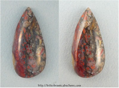 Heart-stopping beautiful Bloodstone! Chatoyant "blood spots" run all down the left side of this neat designer cabochon. Too bad you can't buy it because Gloria at Wire Treasures is going to transform this cab into pendant. 40mm x 19mm x 8mm. Weight: 42.55 carats. Every one of my cabochons is custom cut to take the best advantage of the particular slab from which it is fashioned. Colors may vary somewhat from what is pictured due to differences in computer monitors. Click the image on the right to see the cabochon super-sized... |