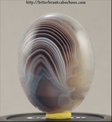 The piece this Botswana Agate cabochon came from reminded me of a broken stalactite: oval in shape and revealing what this agate looks like "outside" the cool patterns we like so much. There was just enough rock to cut this 30x40 oval. For the record, I hate cutting ovals (too much work), but I actually like this one! 40mm x 30mm x 7.5mm. Weight: 68.60 carats. Every one of my cabochons is custom cut to take the best advantage of the particular slab from which it is fashioned. Colors may vary somewhat from what is pictured due to differences in computer monitors. Click the image on the right to see the cabochon super-sized... Do you like Botswana Agates? Click here to see all of the Botswana Agates on the site! |