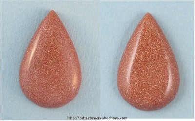 Small Goldstone teardrop. This will make a nice small pendant, you wire wrappers! 34mm x 22mm x 6mm. Weight: 35.75 carats. Every one of my cabochons is custom cut to take the best advantage of the particular slab from which it is fashioned. Colors may vary somewhat from what is pictured due to differences in computer monitors. Click the image on the right to see the cabochon super-sized... |