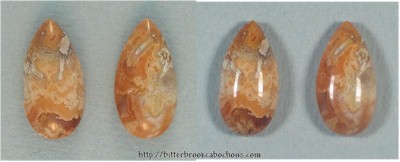 Beautiful gold-tined Lace Agate cabochons, perfect for earrings! Gloria at Wire Treasures wire wrapped these cab into earrings; you can see them here! 18mm x 9mm x 5mm each. Weight: 11.50 carats. Every one of my cabochons is custom cut to take the best advantage of the particular slab from which it is fashioned. Colors may vary somewhat from what is pictured due to differences in computer monitors. Click the image on the right to see the cabochons super-sized... Do you like Lace Agates? Click here to see all of the Lace Agates on the site! |