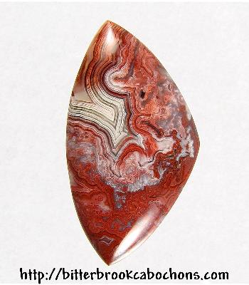 This pretty freeform Lace Agate cabochon was cut from the same slab as this one. Red Lace Agate is one of my favorites, this cab goes from almost solid red at one end to light white lace at the other. Very cool! 22.5mm x 41.5mm x 6mm. Weight: 34.15 carats. Every one of my cabochons is custom cut to take the best advantage of the particular slab from which it is fashioned. Colors may vary somewhat from what is pictured due to differences in computer monitors. Click the image on the right to see the cabochon super-sized... Do you like Lace Agate Cabochons? Click here to see all of the Lace Agate Cabochons on the site! |