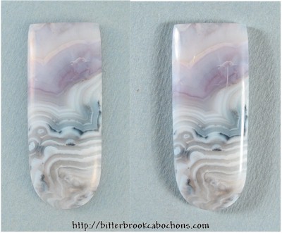 Giant Laguna Agate! Pretty lace with transparency as well as a purple tint at the top. A real beauty! 48mm x 19mm x 5mm. Weight: 42.15 carats. Every one of my cabochons is custom cut to take the best advantage of the particular slab from which it is fashioned. Colors may vary somewhat from what is pictured due to differences in computer monitors. Click the image on the right to see the cabochon super-sized... |