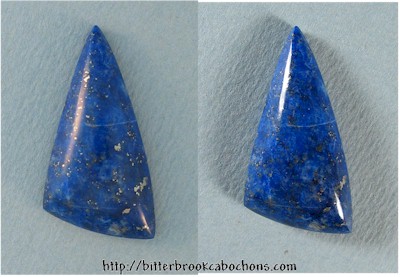 Triangle shaped Lapis. Pyrite flashes all around. A small amount of Calcite, but not as much as you'll see elsewhere. Stable cab. 32mm x 22mm x 6mm. Weight: 21.05 carats. Every one of my cabochons is custom cut to take the best advantage of the particular slab from which it is fashioned. Colors may vary somewhat from what is pictured due to differences in computer monitors. Click the image on the right to see the cabochon super-sized... |