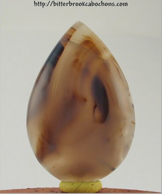 Here's big Montana Agate teardrop with patterns that go one way here and patterns that go another way there. Nice brown patterns in a mostly hazy matrix. See addditional photo for more details. 43mm x 29mm x 7mm. Weight: 61.65 carats. Every one of my cabochons is custom cut to take the best advantage of the particular slab from which it is fashioned. Colors may vary somewhat from what is pictured due to differences in computer monitors. Click the image on the right to see the cabochon super-sized... |