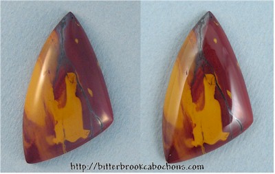 Very nice smallish Mookaite cabochon. Good contrasts between the reds & yellows. I sealed several surface fractures in this one, visible in the photo. Gloria at Wire Treasures wire wrapped this cab into a pendant; you can see it here! 37mm x 21mm x 6mm. Weight: 30.50 carats. Every one of my cabochons is custom cut to take the best advantage of the particular slab from which it is fashioned. Colors may vary somewhat from what is pictured due to differences in computer monitors. Click the image on the right to see the cabochon super-sized... Do you like Mook Jaspers? Click here to see all of the Mook Jaspers on the site! |
