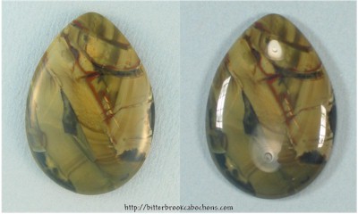Big, fat Morrisonite teardrop cut cabochon with muted patterns. A flash of reddish brown cuts through the middle, next to a tiny yellow flash. This one will make an incredible pendant! 39mm x 27mm x 6mm. Weight: 49.80 carats. Every one of my cabochons is custom cut to take the best advantage of the particular slab from which it is fashioned. Colors may vary somewhat from what is pictured due to differences in computer monitors. Click the image on the right to see the cabochon super-sized... |