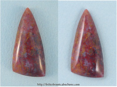 This Moss Agate designer cabochon has pink and golden moss in a milky matrix. Muted patterns in this pretty cab. 40mm x 19mm x 7mm. Weight: 36.30 carats. Every one of my cabochons is custom cut to take the best advantage of the particular slab from which it is fashioned. Colors may vary somewhat from what is pictured due to differences in computer monitors. Click the image on the right to see the cabochon super-sized... |