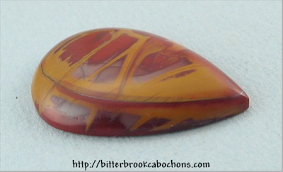 This Noreena Jasper cabochon developed a very interesting pattern as it was being shaped: a red layer was uncovered that followed the right side curve, and it looks really nice! 35mm x 24mm x 5.5mm. Weight: 34.60 carats. Click the image on the right to see the cabochon super-sized...  |