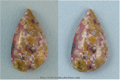Pinkish Ocean Jasper? Yup. This small designer cabochon needed stabilization and I also had to use some super glue to patch a small hole. Very hard to see, but still a patch, hence the low price... 25mm x 15mm x 6mm. Weight: 14.10 carats. Every one of my cabochons is custom cut to take the best advantage of the particular slab from which it is fashioned. Colors may vary somewhat from what is pictured due to differences in computer monitors. Click the image on the right to see the cabochon super-sized... Do you like Ocean Jaspers? Click here to see all of the Ocean Jaspers on the site! |