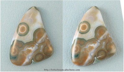 Here's a super Ocean Jasper cabochon with large, sharp orbs in a milky background. Interesting color contrasts towards the bottom of the cab. 40mm x 29mm x 6mm. Weight: 42.20 carats. Every one of my cabochons is custom cut to take the best advantage of the particular slab from which it is fashioned. Colors may vary somewhat from what is pictured due to differences in computer monitors. Click the image on the right to see the cabochon super-sized... Do you like Ocean Jaspers? Click here to see all of the Ocean Jaspers on the site! |