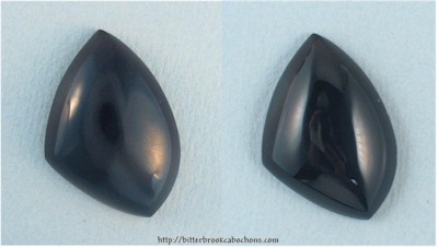 Pregnant triangle cut Onyx midget cabochon. Tiny & shiny! 28mm x 20mm x 7mm. Weight: 24.85 carats. Every one of my cabochons is custom cut to take the best advantage of the particular slab from which it is fashioned. Colors may vary somewhat from what is pictured due to differences in computer monitors. Click the image on the right to see the cabochon super-sized... Do you like Onyxs? Click here to see all of the Onyxs on the site! |