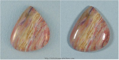 This is the smallest Ocean Wave Jasper cab that I've cut so far. If you like small cabochons, this is a keeper! High polish with no fractures. 29mm x 25mm x 6mm. Weight: 27.65 carats. Every one of my cabochons is custom cut to take the best advantage of the particular slab from which it is fashioned. Colors may vary somewhat from what is pictured due to differences in computer monitors. Click the image on the right to see the cabochon super-sized... |