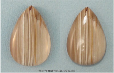 Pretty uniform layers in this Petrified Wood teardrop. There is a coloration on the top of the cabochon that actually looks a like a pre-petrification water stain! 28mm x 18mm x 5mm. Weight: 18.20 carats. Every one of my cabochons is custom cut to take the best advantage of the particular slab from which it is fashioned. Colors may vary somewhat from what is pictured due to differences in computer monitors. Click the image on the right to see the cabochon super-sized... |