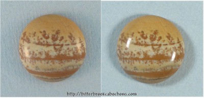Little circle of Picture Jasper. Muted patterns of trees under a soft gold sky. 18mm diameter x 6mm. Weight: 15.35 carats. Every one of my cabochons is custom cut to take the best advantage of the particular slab from which it is fashioned. Colors may vary somewhat from what is pictured due to differences in computer monitors. Click the image on the right to see the cabochon super-sized... |