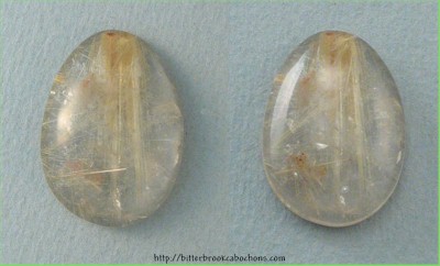 This egg-shaped Rutilated Quartz cabochon has gold-colored Rutile throughout, running in different directions. What looks like flaws on the left is actually Rutile running straight out from the back. There is one small internal flaw at the 2 o'clock position, barely noticeable in the photo. 24.5mm x 17.5mm x 6.5mm. Weight: 21.50 carats. Every one of my cabochons is custom cut to take the best advantage of the particular slab from which it is fashioned. Colors may vary somewhat from what is pictured due to differences in computer monitors. Click the image on the right to see the cabochon super-sized... |