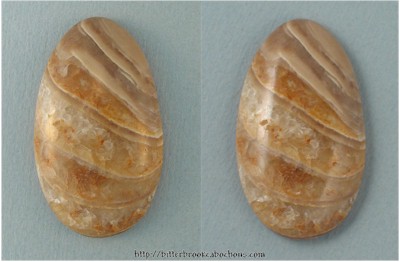 I'm guessing on this one based solely on its appearance, but it looks like Agatized Seashell to me, especially from the back. Solid to crystalline matrix; some places are not smooth where the crystals are the largest. But its not bad, and it's stable. A very cool looking cabochon. 45mm x 26mm x 8mm. Weight: 72.40 carats. Every one of my cabochons is custom cut to take the best advantage of the particular slab from which it is fashioned. Colors may vary somewhat from what is pictured due to differences in computer monitors. Click the image on the right to see the cabochon super-sized... |