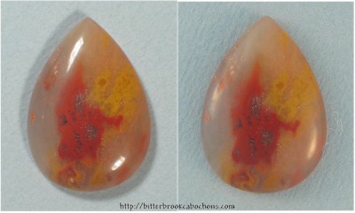 Alabama Paint Rock, from Paint Rock, Alabama. It may sound like "Madam, I'm Adam," but you have to look to find Paint Rock this pretty! 28mm x 20mm x 5.5mm. Weight: 23.25 carats. Every one of my cabochons is custom cut to take the best advantage of the particular slab from which it is fashioned. Colors may vary somewhat from what is pictured due to differences in computer monitors. Click the image on the right to see the cabochon super-sized... |