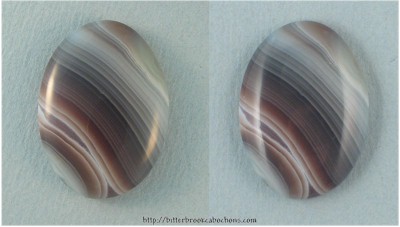 What's this? An oval cabochon at Bitter Brook? Sigh... This started out as a preform, and after talking to it for a while, we decided that its aura would be more peaceful if I left it oval shaped. Very muted vibrations of peace and stability emanate from this one... 29mm x 21mm x 6mm. Weight: 28.75 carats. Every one of my cabochons is custom cut to take the best advantage of the particular slab from which it is fashioned. Colors may vary somewhat from what is pictured due to differences in computer monitors. Click the image on the right to see the cabochon super-sized... Do you like Botswana Agates? Click here to see all of the Botswana Agates on the site! |