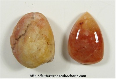 This rock was gathered just a few miles from home. It's known locally, along with other rock found in the spillings of coal mines, as "Brookwood Stone." In Chilton County, the composition of the gravels, derived from the Appalachian Mountains and distributed by the Coosa and Tallapoosa Rivers, is 10% chert and 90% Quartz. This one looks very much like Carnelian. Since this is the first of the find for me, I'm keeping this one in my collection. 26mm x 18mm x 7mm. Weight: 23.85 carats. Click the image on the right to see the cabochon super-sized... |