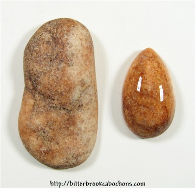 This rock was gathered just a few miles from home. It's known locally, along with other rock found in the spillings of coal mines, as "Brookwood Stone." In Chilton County, the composition of the gravels, derived from the Appalachian Mountains and distributed by the Coosa and Tallapoosa Rivers, is 10% chert and 90% Quartz. This one looks like a Feldspar and has a gazillion flecks of Quartz in it. Wowser! 31mm x 19mm x 9mm. Weight: 36.40 carats. Click the image on the right to see the cabochon super-sized... |