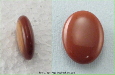 The slab from which this tasty Bruneau Jasper cab was cut was very thick, so I decided to play with it and put a dome on the back side, also. The orb on front disappeared inside the cabochon and the back was completely blank! Hard to get the effect with photos, but this cab looks just like a piece of English Toffee! But don't eat it!