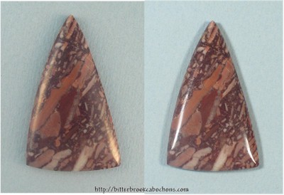 I'm going to call this Conglomerate, but I'm not sure. Pinks & reds in a big triangle shaped cabochon. 46mm x 23mm x 5mm. Weight: 39.80 carats. Every one of my cabochons is custom cut to take the best advantage of the particular slab from which it is fashioned. Colors may vary somewhat from what is pictured due to differences in computer monitors. Click the image on the right to see the cabochon super-sized... |