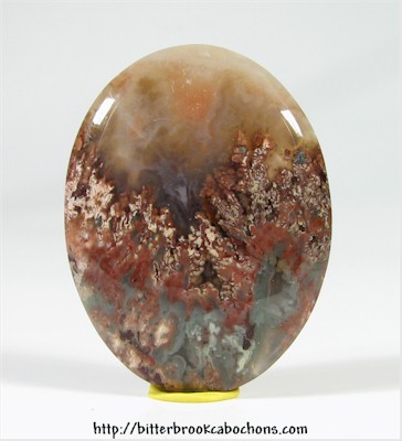 This is some pretty stuff! Identified to me as Idaho Plume, and I wish I had a bucket full of it. Highly defined plumes, with some greenish-blue colored areas towards the bottom. I probably should keep this one... 40mm x 30.5mm x 5.5mm; cab has a flat girdle. Weight: 53.05 carats. Every one of my cabochons is custom cut to take the best advantage of the particular slab from which it is fashioned. Colors may vary somewhat from what is pictured due to differences in computer monitors. Click the image on the right to see the cabochon super-sized... |