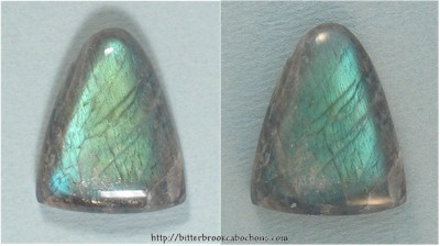 Pale blue fire in this Labradorite cabochon make it a standout! The fire shows best from slightly above the cab, so it would look terrific in a pendant! 26mm x 21mm x 7mm. Weight: 28.15 carats. Every one of my cabochons is custom cut to take the best advantage of the particular slab from which it is fashioned. Colors may vary somewhat from what is pictured due to differences in computer monitors. Click the image on the right to see the cabochon super-sized... Do you like Labradorites? Click here to see all of the Labradorites on the site! |