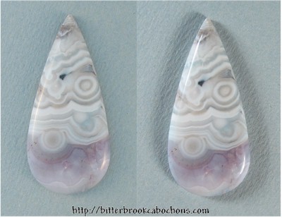 Big teardrop shaped Laguna Agate. Pretty lace & orbs as well as a purple tint at the bottom. A real beauty! 46mm x 21mm x 5mm. Weight: 31.60 carats. Click the image on the right to see the cabochon super-sized... |