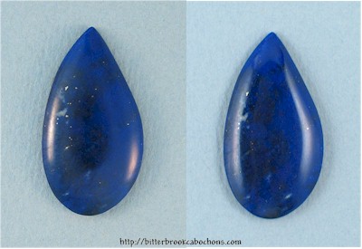 Here's a sweet little Lapis cabochon. Asymmetric teardrop shape with just a few Calcite spots on the left side. The small bright spots you see in the photos are Pyrite which caught the photographer's light just right. In normal light, the Pyrite is barely visible; see the extra photos at the bottom of the page to see the difference changes in lighting make. 28mm x 15mm x 4mm. Weight: 12.80 carats. Every one of my cabochons is custom cut to take the best advantage of the particular slab from which it is fashioned. Colors may vary somewhat from what is pictured due to differences in computer monitors. Click the image on the right to see the cabochon super-sized... |