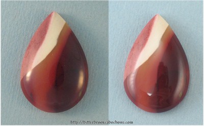 Terrific bold contrasts in this teardrop cut Mookaite cabochon! Dark, dark reds and near-white colors make this a real standout! Gloria at Wire Treasures wire wrapped this cab into a pendant; you can see it here! 33mm x 22mm x 7mm. Weight: 35.95 carats. Every one of my cabochons is custom cut to take the best advantage of the particular slab from which it is fashioned. Colors may vary somewhat from what is pictured due to differences in computer monitors. Click the image on the right to see the cabochon super-sized... Do you like Mook Jaspers? Click here to see all of the Mook Jaspers on the site! |