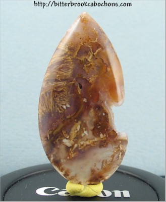 This pretty Moss Agate cabochon has soft gold tones throughout, with some translucent areas AND a big drusy pocket on the side. I included a second photo so you could see what this beauty looks like "out" in the light. -. Weight: 37.40 carats. Every one of my cabochons is custom cut to take the best advantage of the particular slab from which it is fashioned. Colors may vary somewhat from what is pictured due to differences in computer monitors. Click the image on the right to see the cabochon super-sized... |