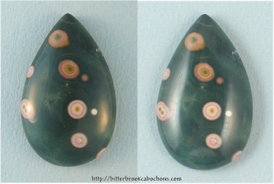 Big, heavy Ocean Jasper teardrop. Crisp to muted orbs; the second big orb from the top has two "echo" orbs to its right (the smaller is barely visible). There is a small chip on the lower right edge that is not visible from the front, and a scratch on the back (made probably by me); hence the lower price. 43mm x 27mm x 9mm. Weight: 74.90 carats. Every one of my cabochons is custom cut to take the best advantage of the particular slab from which it is fashioned. Colors may vary somewhat from what is pictured due to differences in computer monitors. Click the image on the right to see the cabochon super-sized... Do you like Ocean Jaspers? Click here to see all of the Ocean Jaspers on the site! |