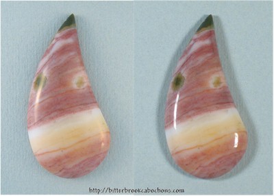 The bright band across the lower part of this cabochon is distinctly yellow, although it does not look so in the photo. I cut this shape to give some impression of motion, but you won't get seasick if you buy this cab, I promise! 50mm x 24mm x 6mm. Weight: 52.50 carats. Every one of my cabochons is custom cut to take the best advantage of the particular slab from which it is fashioned. Colors may vary somewhat from what is pictured due to differences in computer monitors. Click the image on the right to see the cabochon super-sized... |