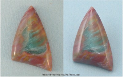 This is the coolest piece of Ocean Wave I've seen! This cabochon has a bright sea green (perfect!) area front and center. AND, it has pyrite-like sparklies throughout the green area! 38mm x 23mm x 6mm. Weight: 36.70 carats. Every one of my cabochons is custom cut to take the best advantage of the particular slab from which it is fashioned. Colors may vary somewhat from what is pictured due to differences in computer monitors. Click the image on the right to see the cabochon super-sized... |