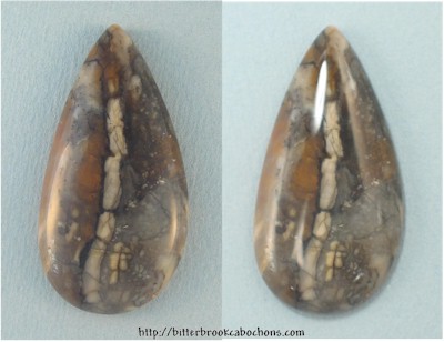 This BIG Picnic Jasper cabochon doesn't have a lot of coloration, but it DOES have a well-defined "backbone." This slightly assymetrical teardrop cab is no substitute, however, for an X-ray when your back's bothering you... 49mm x 25mm x 7mm. Weight: 62.90 carats. Every one of my cabochons is custom cut to take the best advantage of the particular slab from which it is fashioned. Colors may vary somewhat from what is pictured due to differences in computer monitors. Click the image on the right to see the cabochon super-sized... |