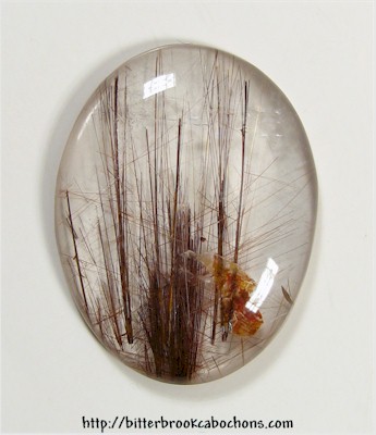 This dainty Rutilated Quartz cabochon has lots of Rutile, with an inclusion at lower right. Sweet! 29mm x 22mm x 5mm. Weight: 23.15 carats. Every one of my cabochons is custom cut to take the best advantage of the particular slab from which it is fashioned. Colors may vary somewhat from what is pictured due to differences in computer monitors. Click the image on the right to see the cabochon super-sized... |