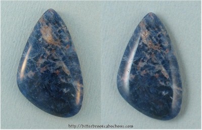 Milky white inclusions at the top of this Sodalite cabochon fade away to dark blue at the bottom with lots of chatoyant particles in the blue part! You probably won't notice the chatoyance so much if this cab is worn as pendant, but it's fun to look at it while turning it under the light. 37mm x 22mm x 6mm. Weight: 31.00 carats. Every one of my cabochons is custom cut to take the best advantage of the particular slab from which it is fashioned. Colors may vary somewhat from what is pictured due to differences in computer monitors. Click the image on the right to see the cabochon super-sized... |