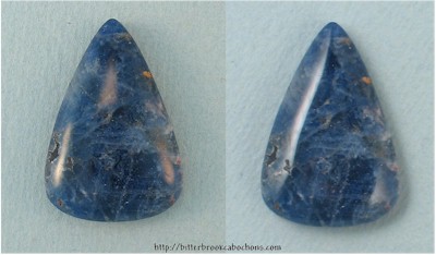 This flat-bottomed teardrop cut Sodalite cabochon has a milky haze and one large vug on the left as seen in the photos. Still a nice specimen. 28mm x 19mm x 6mm. Weight: 19.15 carats. Every one of my cabochons is custom cut to take the best advantage of the particular slab from which it is fashioned. Colors may vary somewhat from what is pictured due to differences in computer monitors. Click the image on the right to see the cabochon super-sized... |